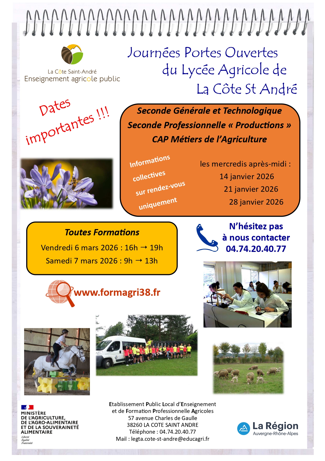 Le Lycée Agricole de la Côte St André organise des réunions d’information collective dans les semaines à venir, et des journées portes ouvertes en mars prochain. Vous trouverez en pièce jointe l’ensemble des dates proposées.