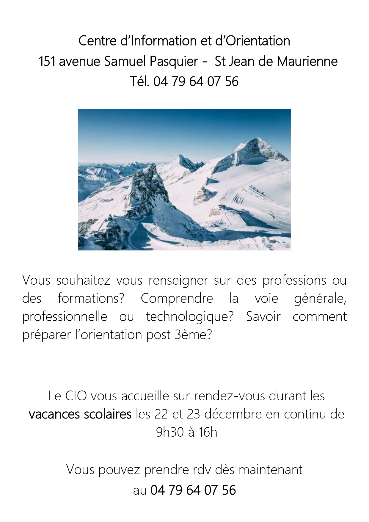 Vous trouverez en pièce jointe une affiche concernant l'Ouverture du CIO pendant les vacances scolaires de décembre du 22 et 23 décembre 2025.
