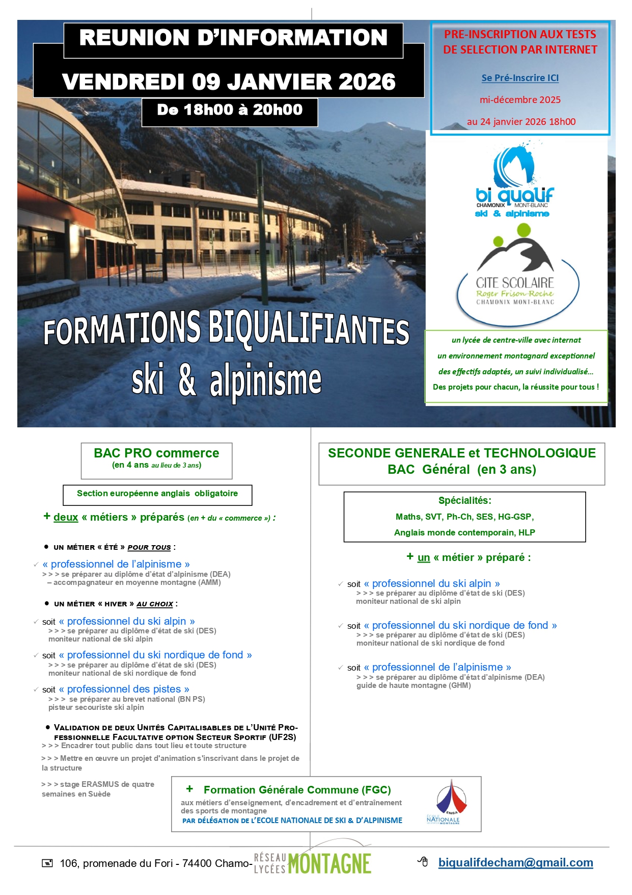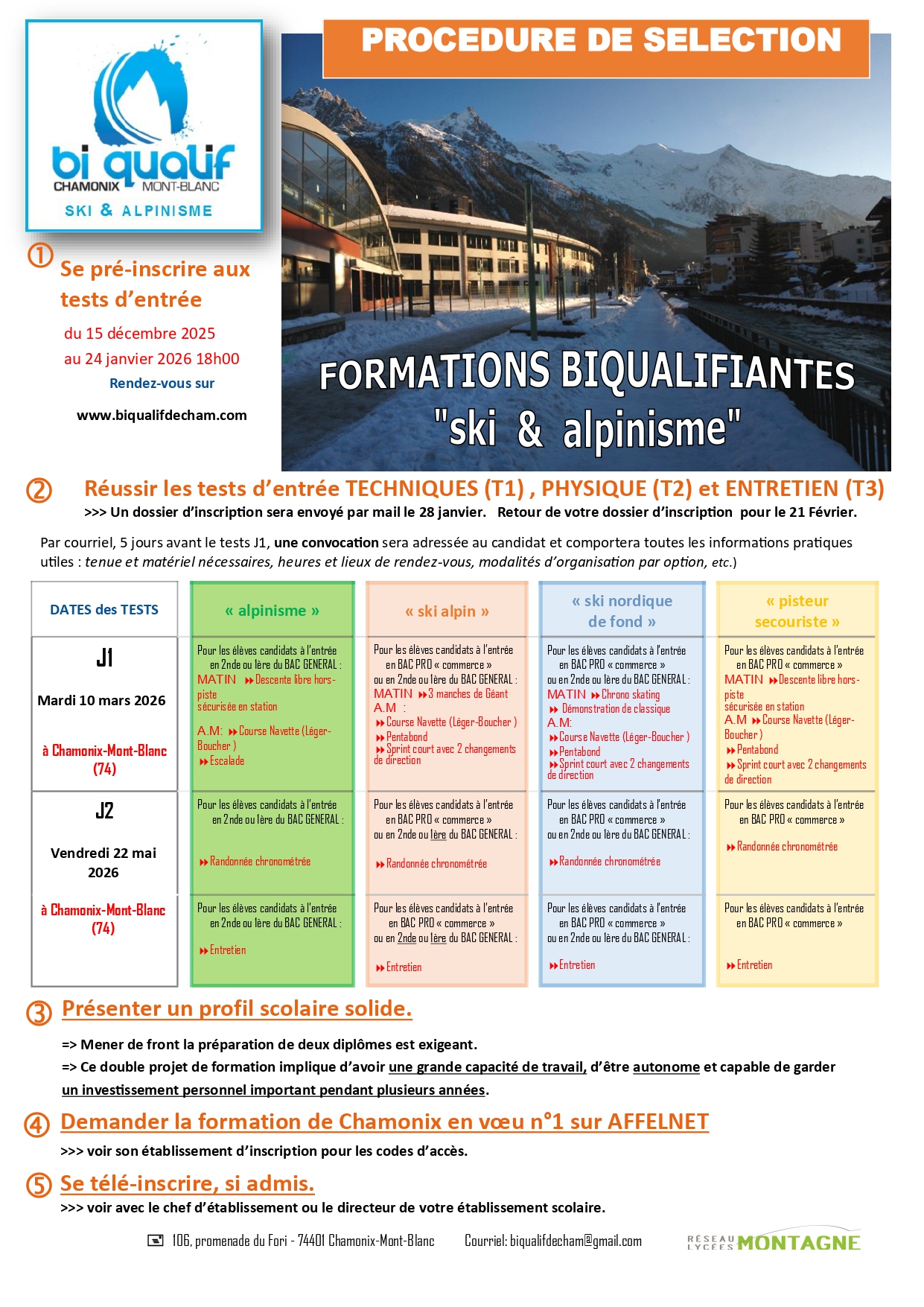 Pré-inscriptions aux tests d'entrée en biqualification 2026 - Lycée Roger Frison-Roche Chamonix